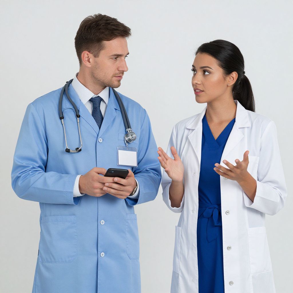 Two individuals dressed in medical attire stand side by side, featuring a man in a light blue lab coat with a stethoscope and name badge, holding a smartphone, and a woman in a white lab coat over a royal blue dress, gesturing with her hands.