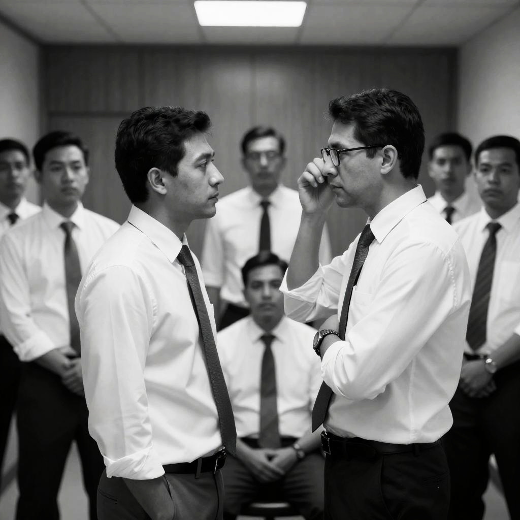 Black and white photograph of seven men in suits seated in a row, all looking forward. Central man in light-colored suit and dark tie, two men on either side, three men behind. Formal attire, neutral expressions, wood-paneled background.