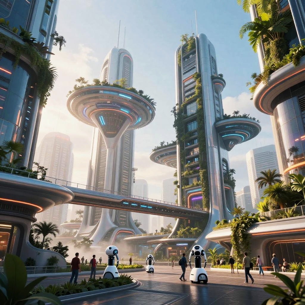 Futuristic looking city skyline under a starry sky, towering metallic and glass structures with integrated greenery, advanced public transport systems visible, bright neon hues reflecting on wet streets, a blend of cyberpunk and utopian architecture with flying drones overhead.