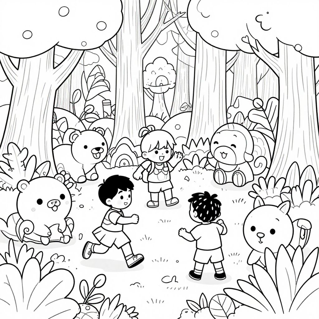 Coloring page children playing in a magical forest, surrounded by friendly animals and fantasy plants, line art with bold outlines, clear spaces for coloring, whimsical and imaginative design that sparks creativity in kids, detailed but accessible drawings