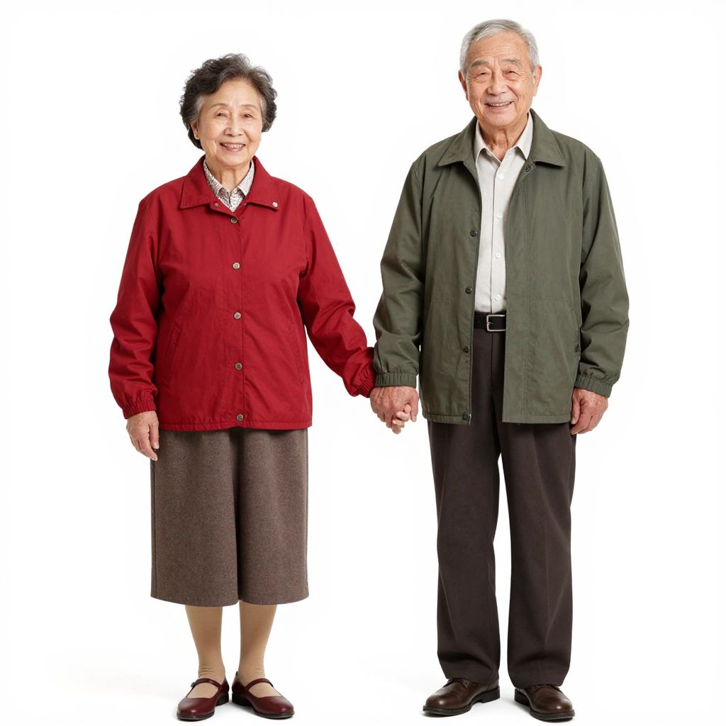 Two elderly individuals stand hand-in-hand against a plain white background, with the woman wearing a red jacket and brown skirt, and the man dressed in a green jacket and dark pants, both smiling warmly.