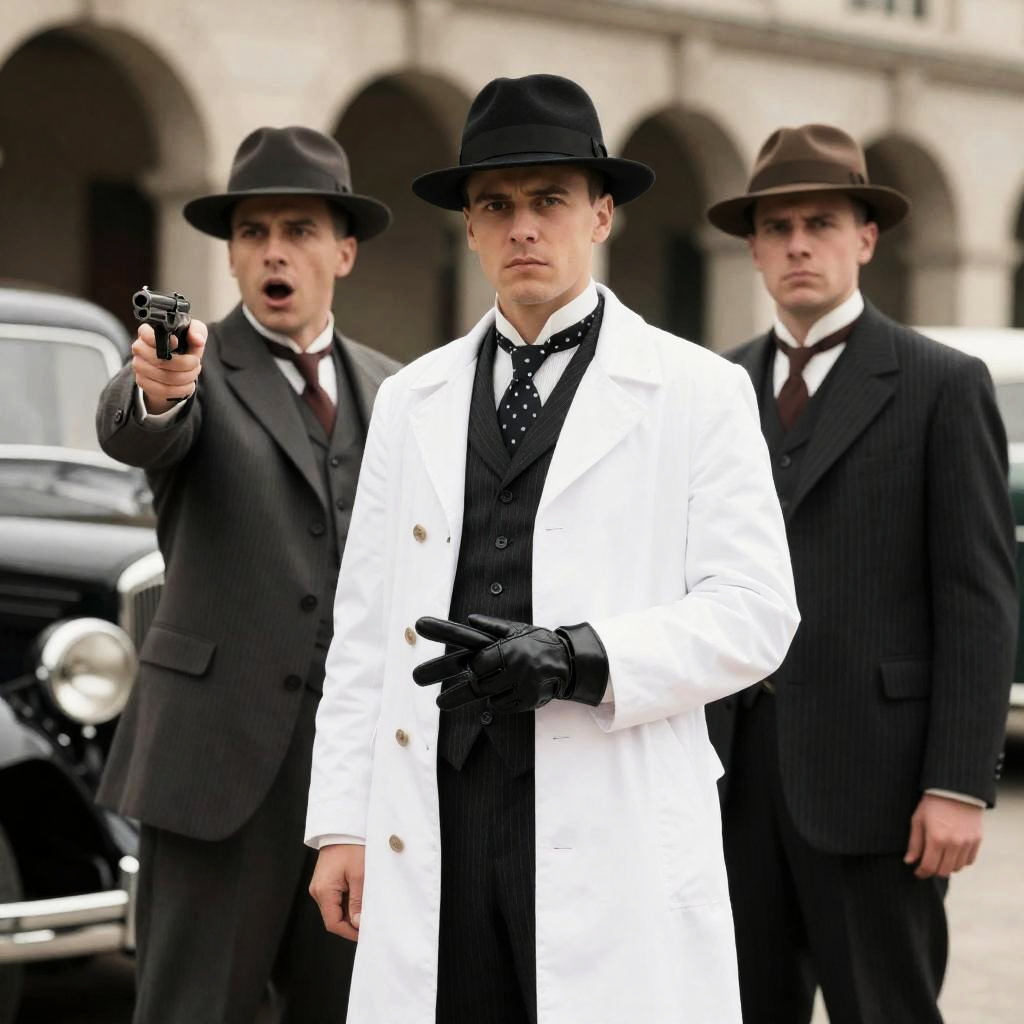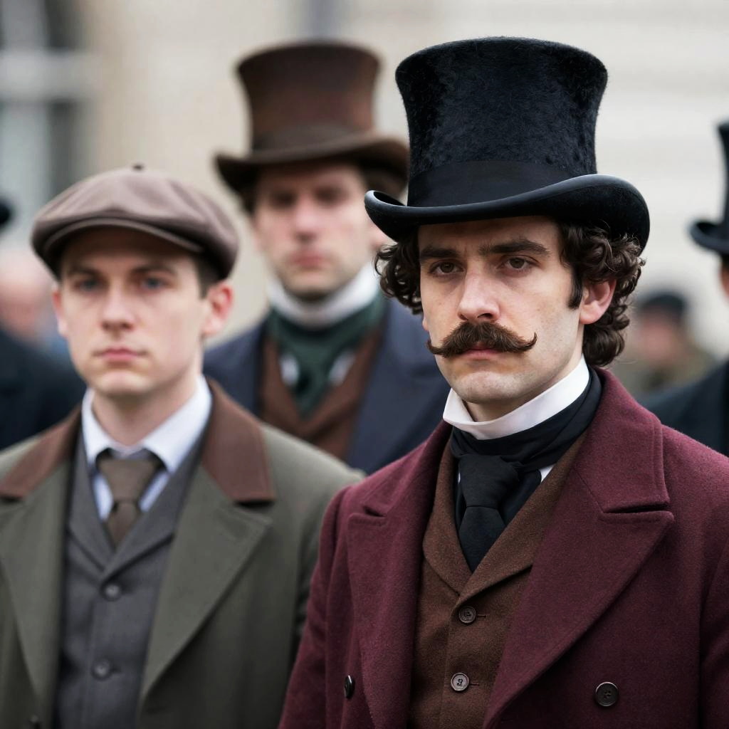 Photograph of a crowded street scene in the early 20th century. A young man with fair skin, dark eyes, and a neutral expression stands in the foreground, wearing a brown tweed coat and black hat. He is surrounded by numerous people, mostly men in dark suits and hats, holding books and bags. Buildings with stone facades and wooden structures are in the background. The crowd is dense, with some individuals turned away, showing the back of their heads.