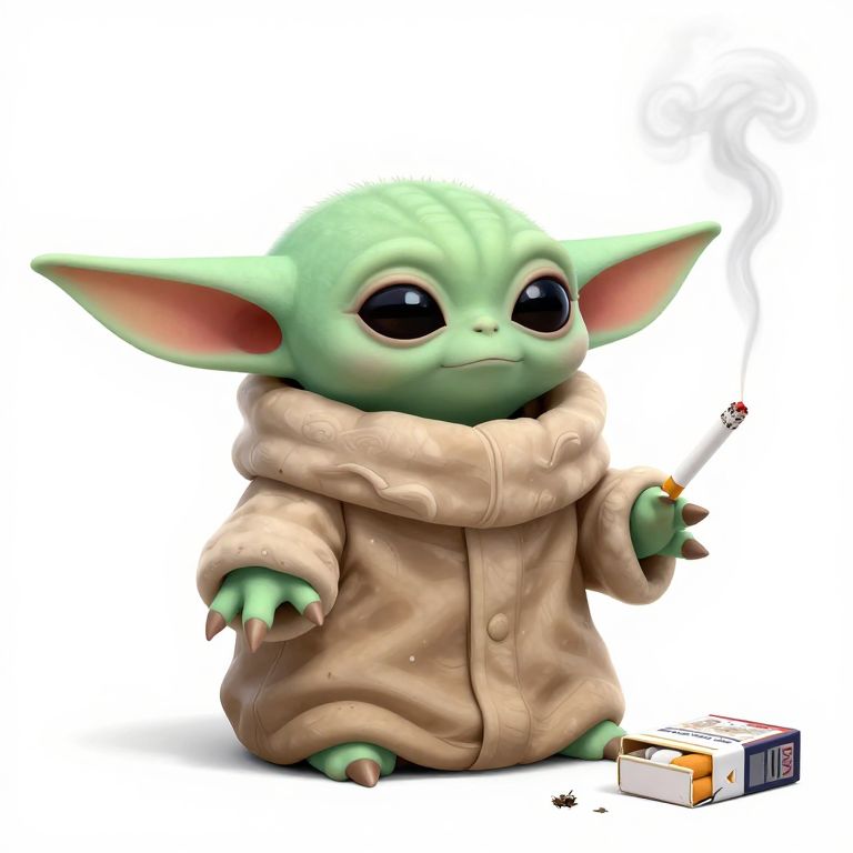 Digital illustion of baby grogu smoking a cigarette, sitting next to a discarded pack of cigarettes, deviantart, artstation, artstation hq, hd, 4k resolution