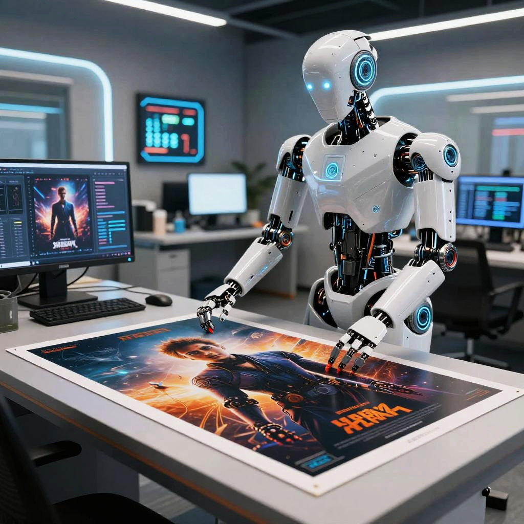 Ai movie poster maker at work, futuristic robot in a modern design studio crafting personalized movie posters with intricate details, glowing UI panels, vibrant palette, sci-fi ambiance, realistic textures, cinematic composition, digital creativity theme
