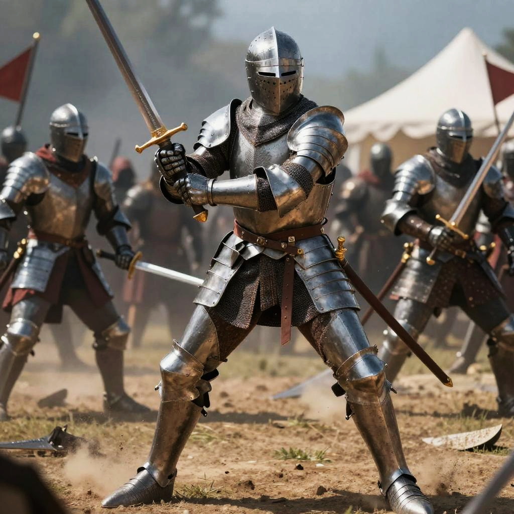 Sword wielding poses of a medieval knight in shining armor, dynamic battlefield setting, dramatic lighting, detailed textures, cinematic composition, action-packed scene