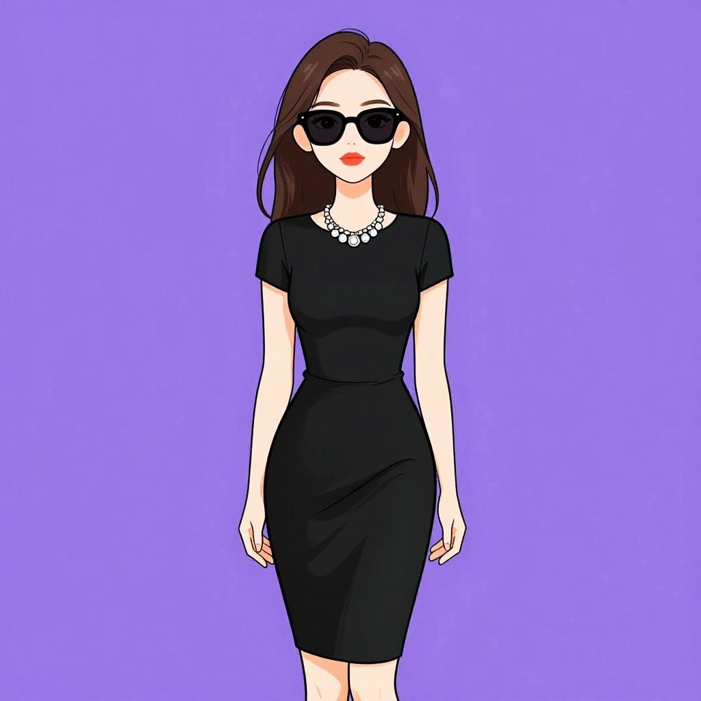 Woman with pretty face and pretty hair. Woman, chic, black short-sleeved knee-length dress, simple silhouette, round neckline, fitted at the waist, statement silver necklace, dark sunglasses, hair down. --sref 1461