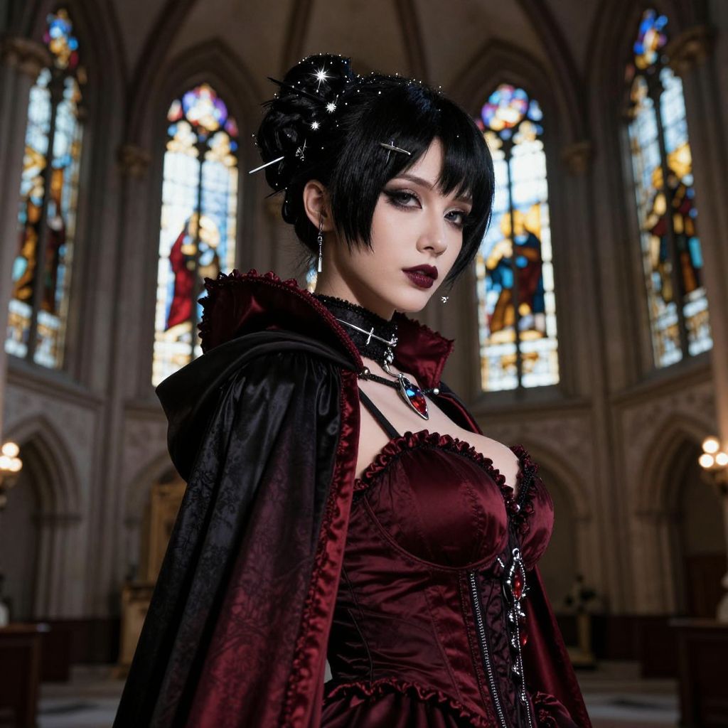 A stunning, tall woman with rich black hair styled into a daring short updo with sparkles and metallic clips, dressed in a dark, gothic-style costume with deep crimson fabric and a long cape, standing in a dimly lit underground cathedral filled with stained glass windows; her face is sharp, with high cheekbones and a calm, mysterious gaze. The woman has big tits and cute face