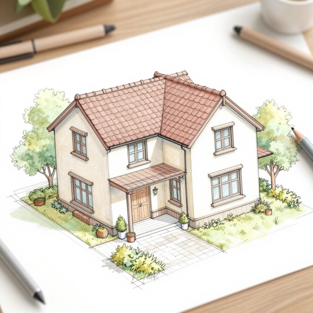 Floor plan maker creative depiction of a cozy two-story cottage blueprint, combining hand-drawn sketch style with digital polish, warm pastel color scheme, detailed roofing, window placements, garden planning elements, blending traditional architecture with cutting edge digital floor planning tools.