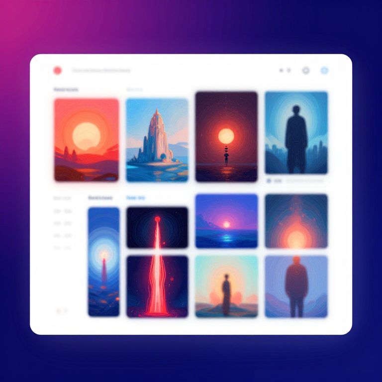 AI image generator web interface, sleek modern design with vibrant colors, displaying various generated artworks on screen, futuristic digital art style, high resolution