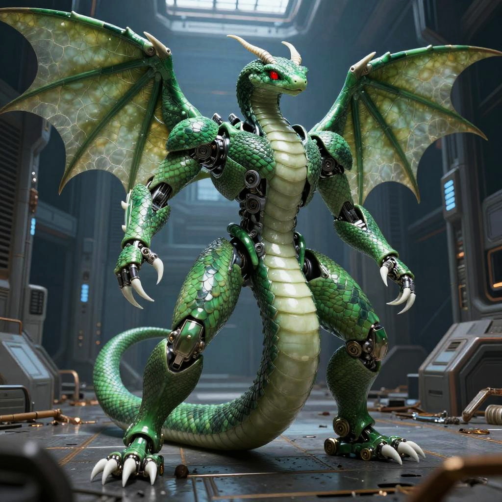 Emerald Serpent Mecha Dragon in Sci-Fi Corridor