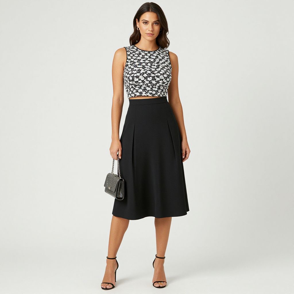 "Woman, chic, floral print crop top in black and white, sleeveless, round neckline, midi A-line skirt with pleats, solid black color, high-waisted, open-toe stiletto sandals, metallic clutch with a chain strap.. Sexy. Pretty face and beаutiful eyes. Big breasts."