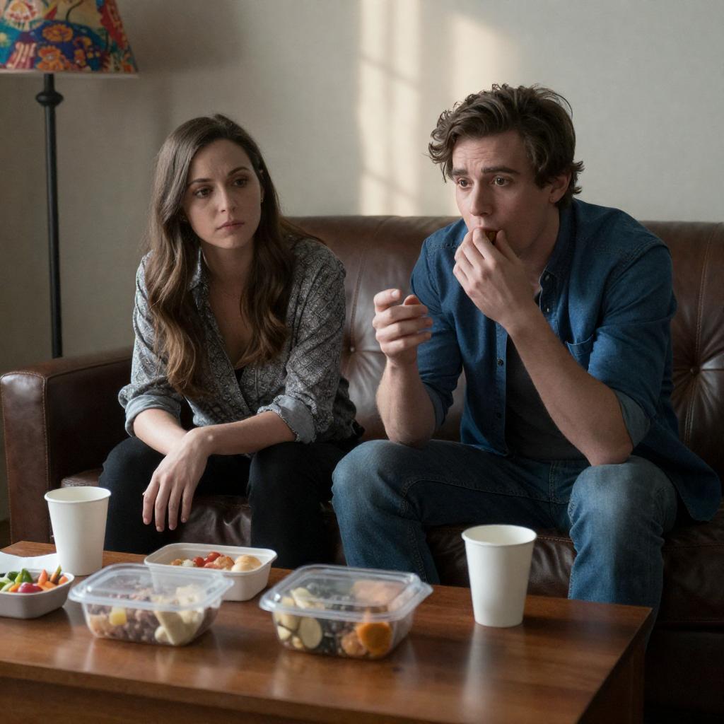 Photograph of two people sitting on a leather couch in a dimly lit room. Woman with long brown hair, wearing a gray patterned blouse, looks pensive. Man with brown hair, wearing a blue shirt, gestures with his hand while eating. Wooden coffee table in front with food containers, disposable cups, and a lamp with a colorful shade. Sunlight filters through curtains in the background.