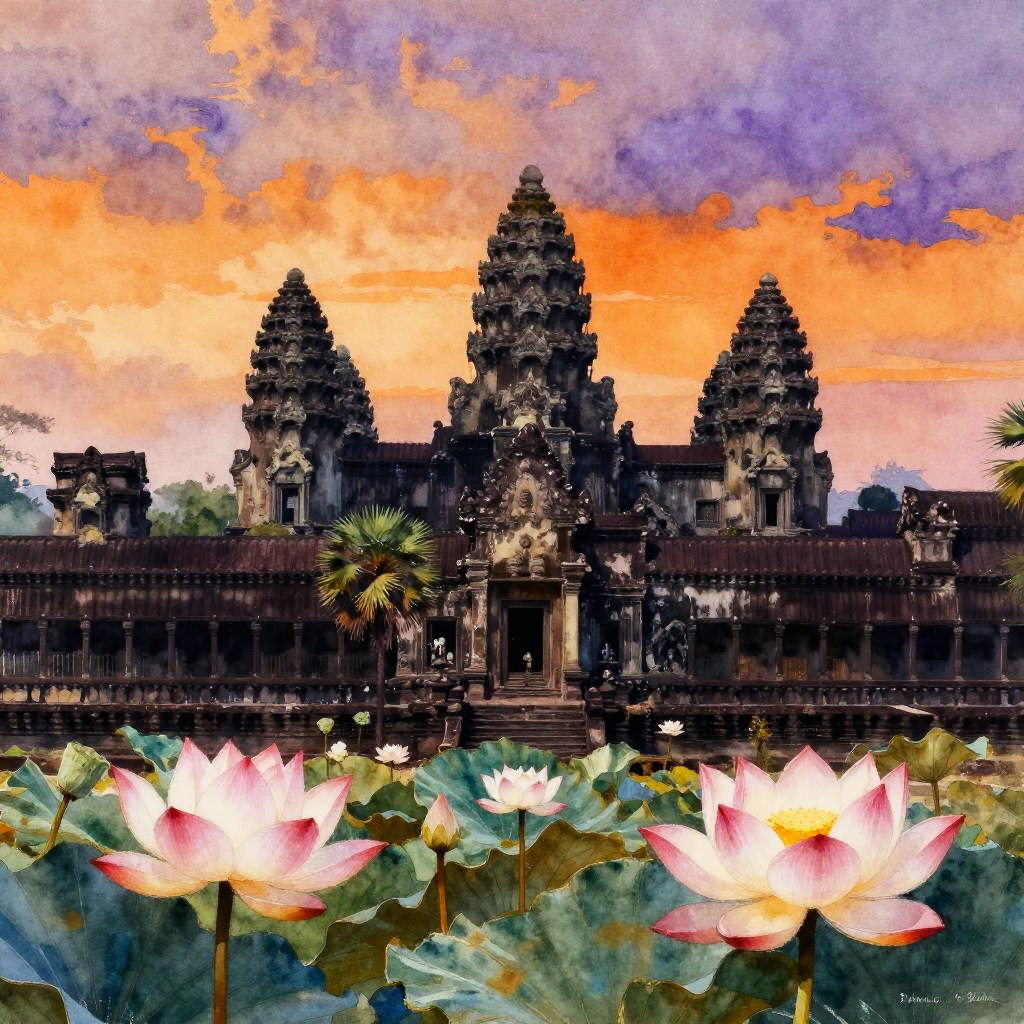 Angkor Wat drawing, architectural blueprint style rendering, precise and technical lines highlighting the structure and layout of the temple complex, annotations of Khmer symbols and motifs, monochrome with sepia accents for an antique effect, clean and minimalistic composition.
