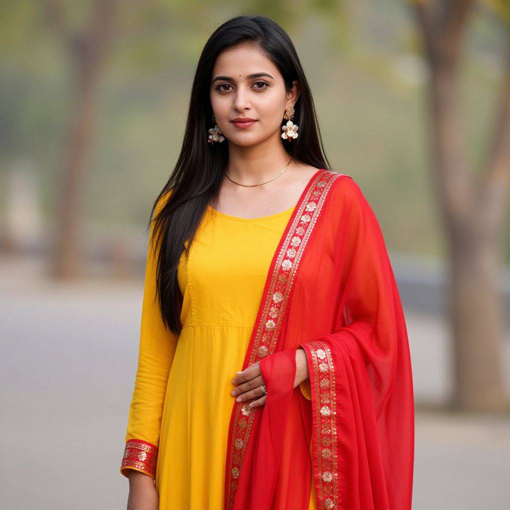 "salwar kameez design costume, 1girl, solo, jewelry, earrings, realistic, necklace, black hair, bag, dress, looking at viewer, plant Realistic photo of casual sexy person with pretty face"