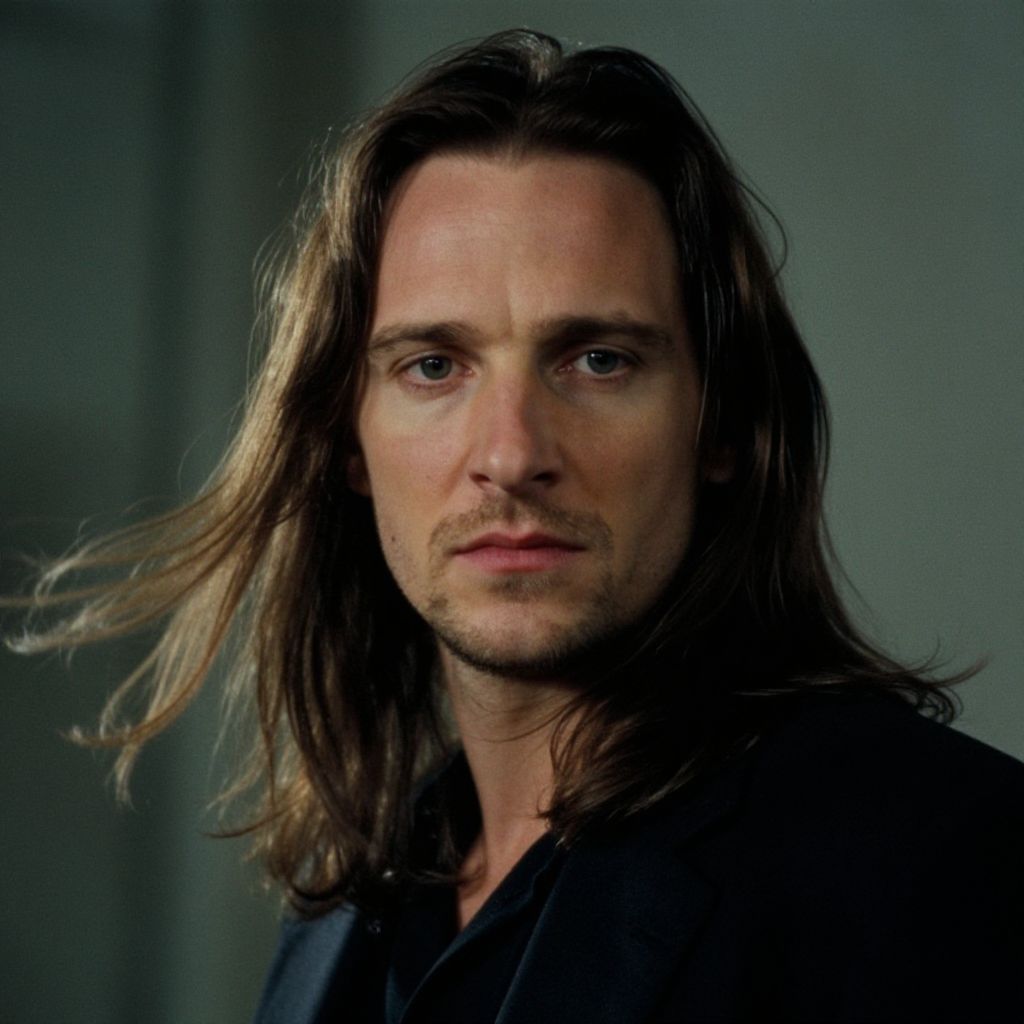 Photograph of a Caucasian man with long, straight, brown hair that reaches his shoulders. He has blue eyes, light stubble, and a serious expression. He is wearing a black shirt and is positioned against a blurred, dark gray background. The lighting is soft, highlighting his facial features while casting gentle shadows. The image has a slightly dramatic, cinematic feel, focusing on his intense gaze and subtle facial details. The overall composition emphasizes his serious demeanor and rugged appearance.