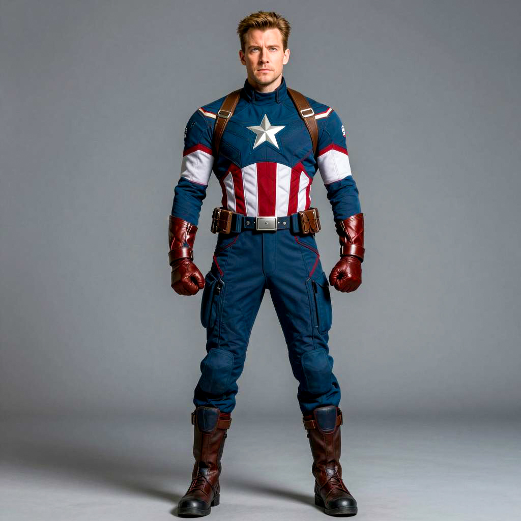 Captain man costume, photograph of male superhero standing, full body, black and red superhero suit, star emblem on chest, red cape, black helmet with "A" on forehead, black gloves and boots, muscular build, serious expression, gray background, daytime, realistic, cinematic style