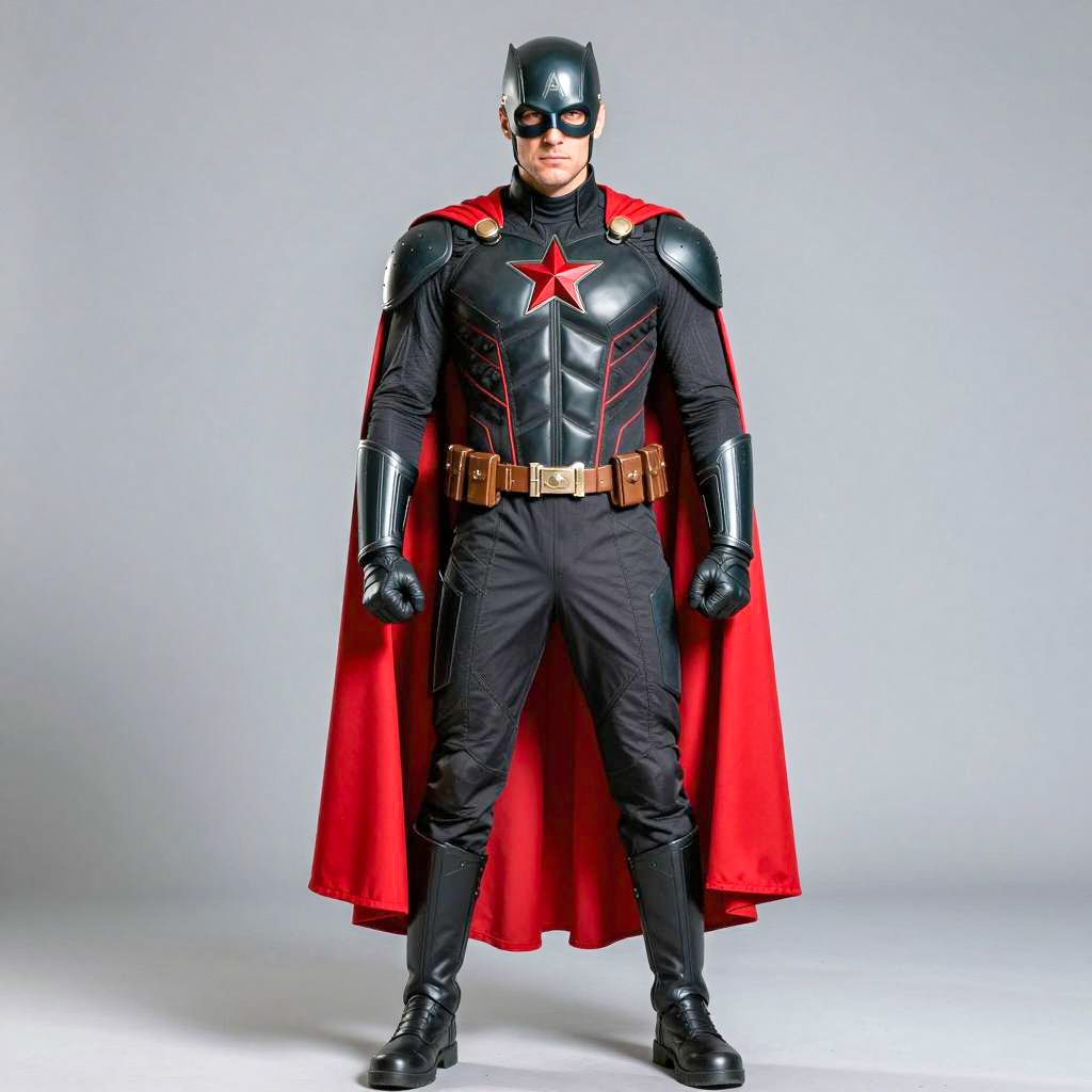 Full-body photograph of a male superhero wearing a black and red costume featuring a red star emblem on the chest and a red cape. The outfit includes a black helmet with an 'A' on the forehead, black gloves, and black boots. The muscular man stands with a serious expression against a plain gray background in a cinematic, realistic style.