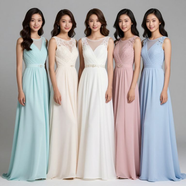 Five Asian women in elegant, floor-length dresses (light blue, white, pink, blue) stand together against a gray background, smiling. Photographic