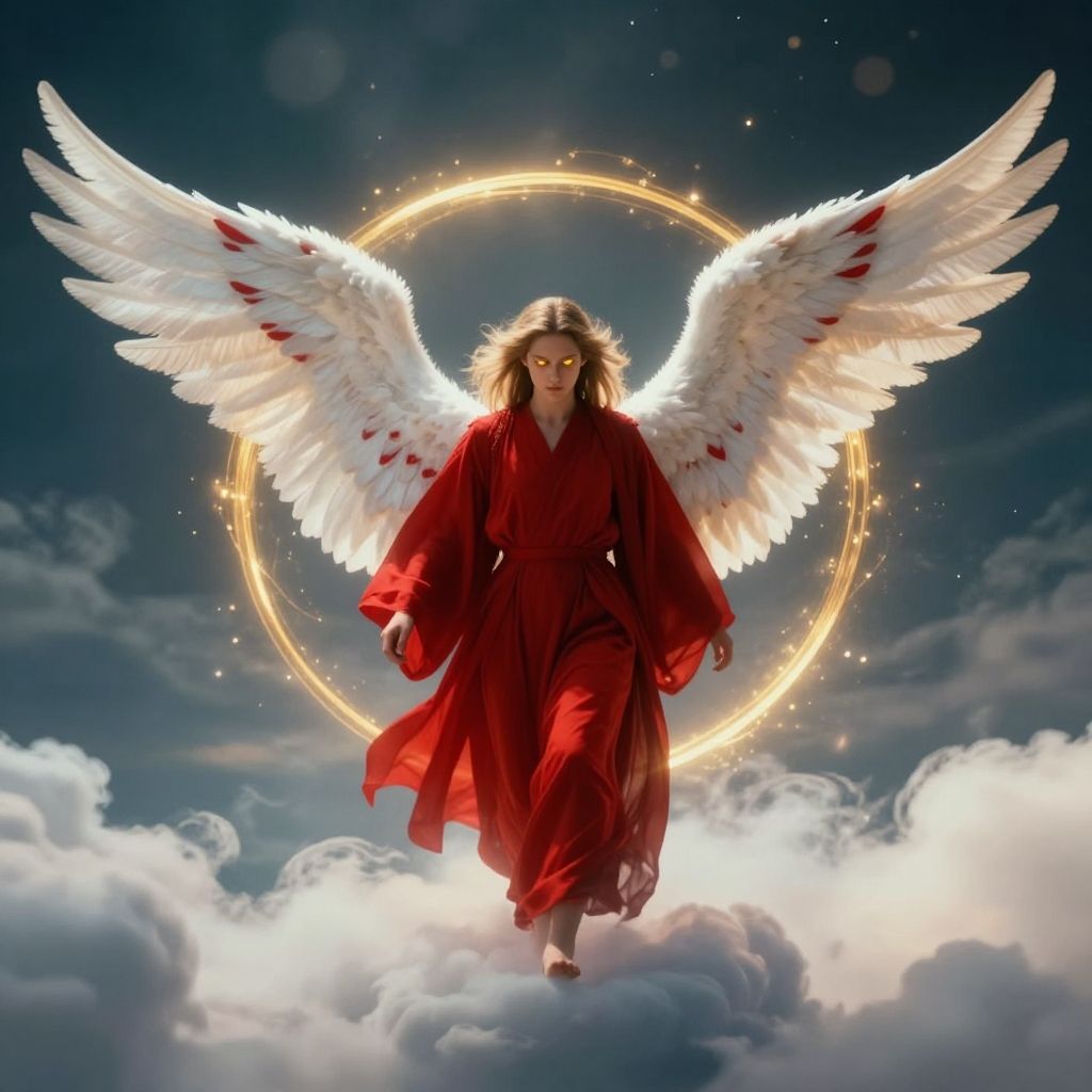 Digital artwork of an angelic woman with white wings and red robe, walking on clouds, framed by a glowing golden halo.