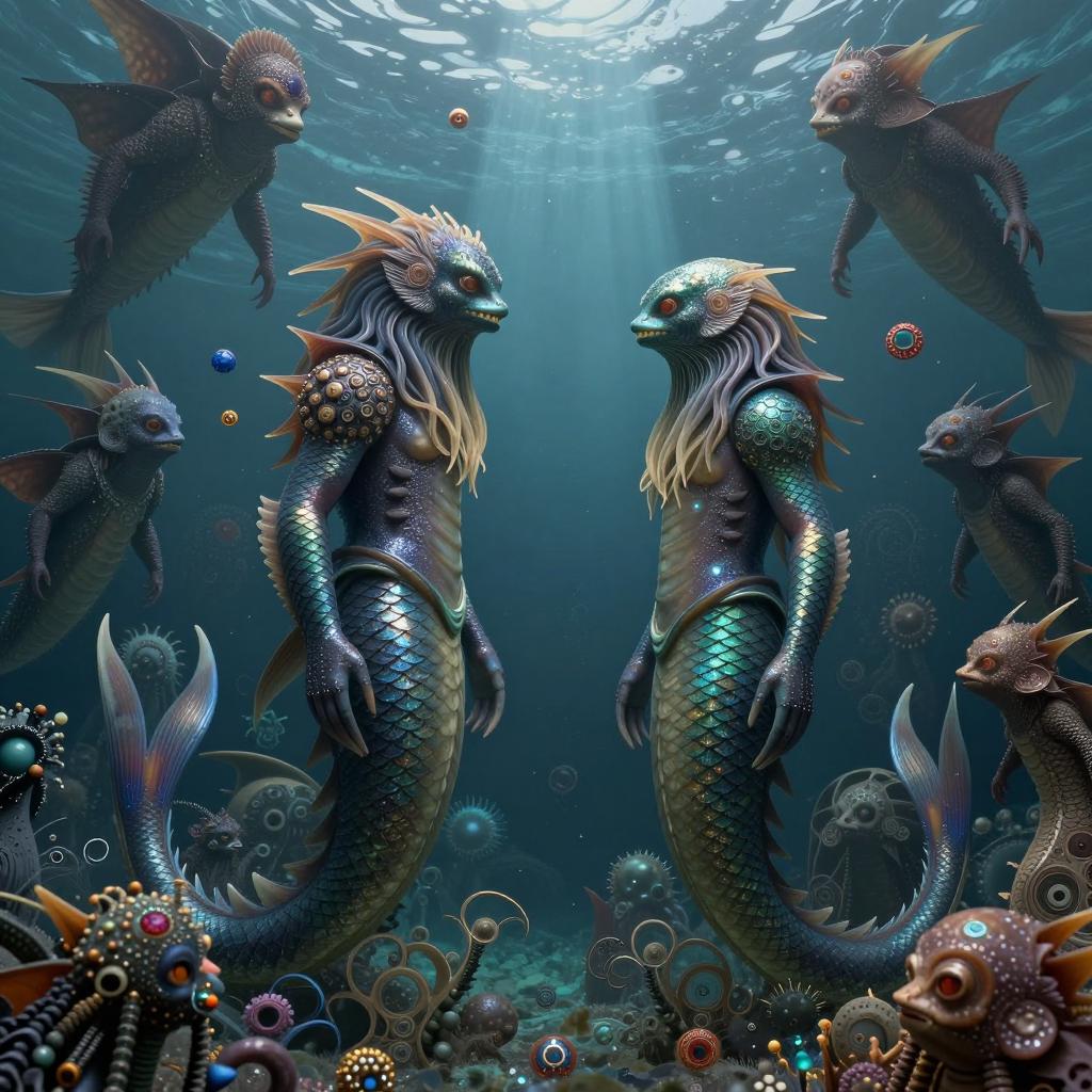 Ultra-realistic, highly detailed fantasy portrait of two intricate merfolk facing each other underwater, surrounded by an army of smaller merfolk and mystical artifacts. The scene is rendered with fractal-inspired textures and a wide-angle perspective, showcasing complex scale patterns, ornate armor, and glowing eyes. Soft ocean light filters from above illuminating the mysterious deep-sea environment.