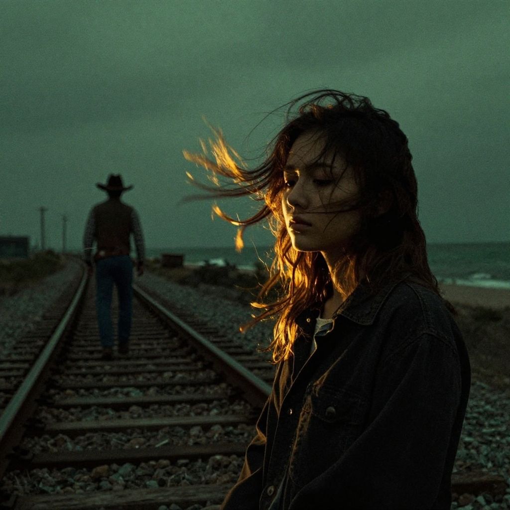 1girl, film grain, vintage tone, high contrast, dim lighting, dark green theme, melancholy, sad, railroad tracks, seaside, wind, motion blur, reversal, flustered, floating hair, spinning, cowboy shot, golden lighting moment, overall, (cropped shoulder:1.2)