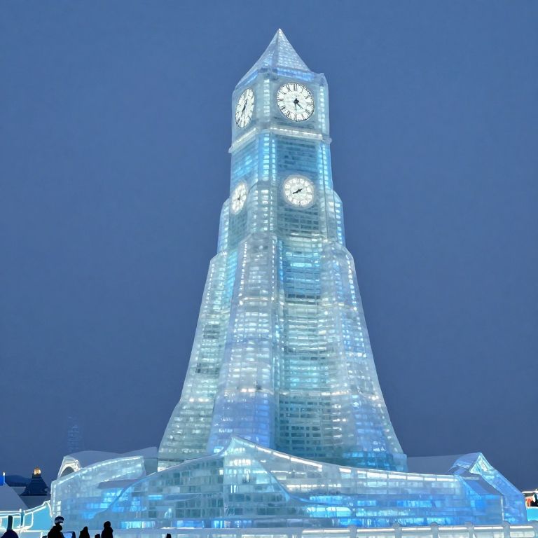 A towering, translucent clock tower composed of shimmering icicles stands defiantly amidst a frosty valley, its glowing faces defying gravity as they pulse with an otherworldly light, casting a surreal glow over the snow-covered landscape below.