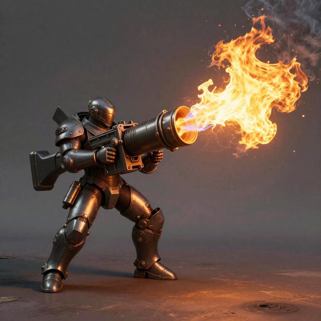 Flamethrower drawing in a futuristic sci-fi style, glowing orange flames bursting from the nozzle, intricate mechanical details, dynamic action pose, high contrast shadows