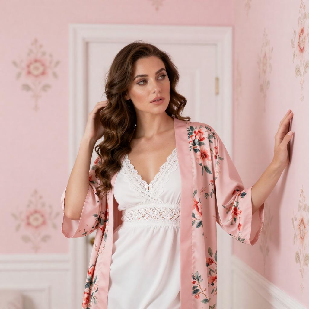 Woman with wavy brown hair, wearing a pink floral robe over a white lace-trimmed dress, stands against a pink floral wallpapered wall, right hand touching her hair, left hand on the wall, looking slightly to the side with a neutral expression. Background shows a white-framed doorway.