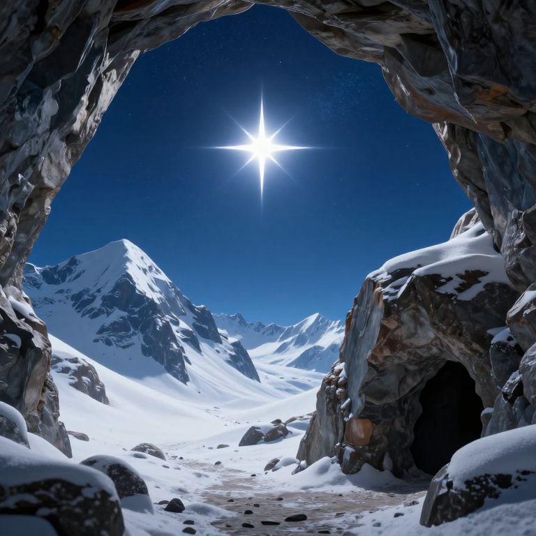A serene 3D-rendered landscape captures a celestial scene where a radiant star shines brightly against a deep blue sky, framed by rugged, snow-covered mountains and a rocky cave entrance, evoking a sense of cosmic wonder and tranquility.