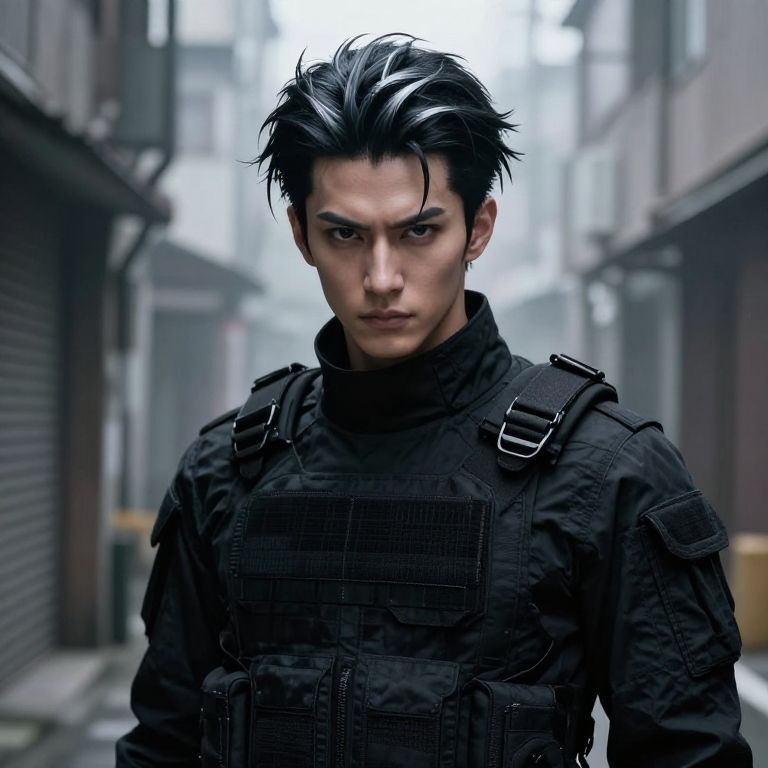 Toji Fushiguro appearance, intense dark hair swept back with silver streaks, sharp piercing eyes, wearing a sleek black tactical outfit, standing in a misty urban alley, dramatic lighting