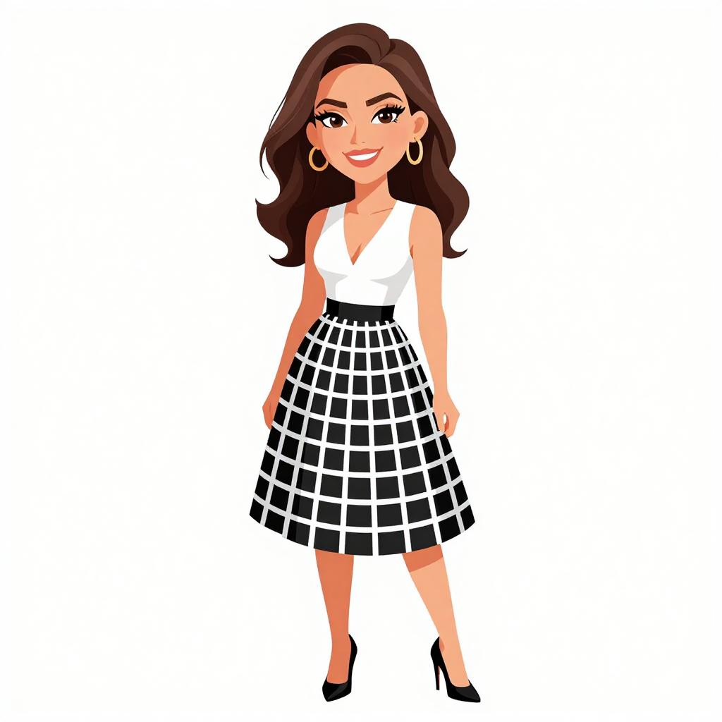 Woman with pretty face and pretty hair. smiling Woman, classic style, strapless A-line dress, black and white stripes with varying shades of brown, knee-length, black heeled sandals with ankle strap. --sref 1467