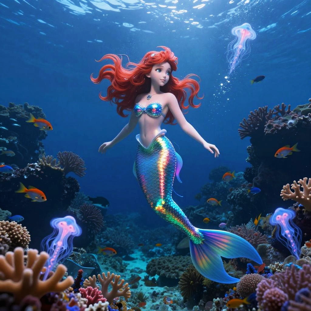 Deep sea ariel, a mystical underwater scene with a radiant mermaid surrounded by glowing coral reefs and bioluminescent fish, ultra-detailed, vibrant colors, cinematic lighting