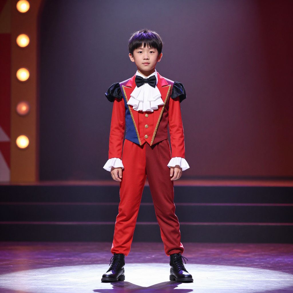 Photograph of a young Asian boy in a red circus-style outfit with black trim, white ruffled shirt, and black boots, standing on a brightly