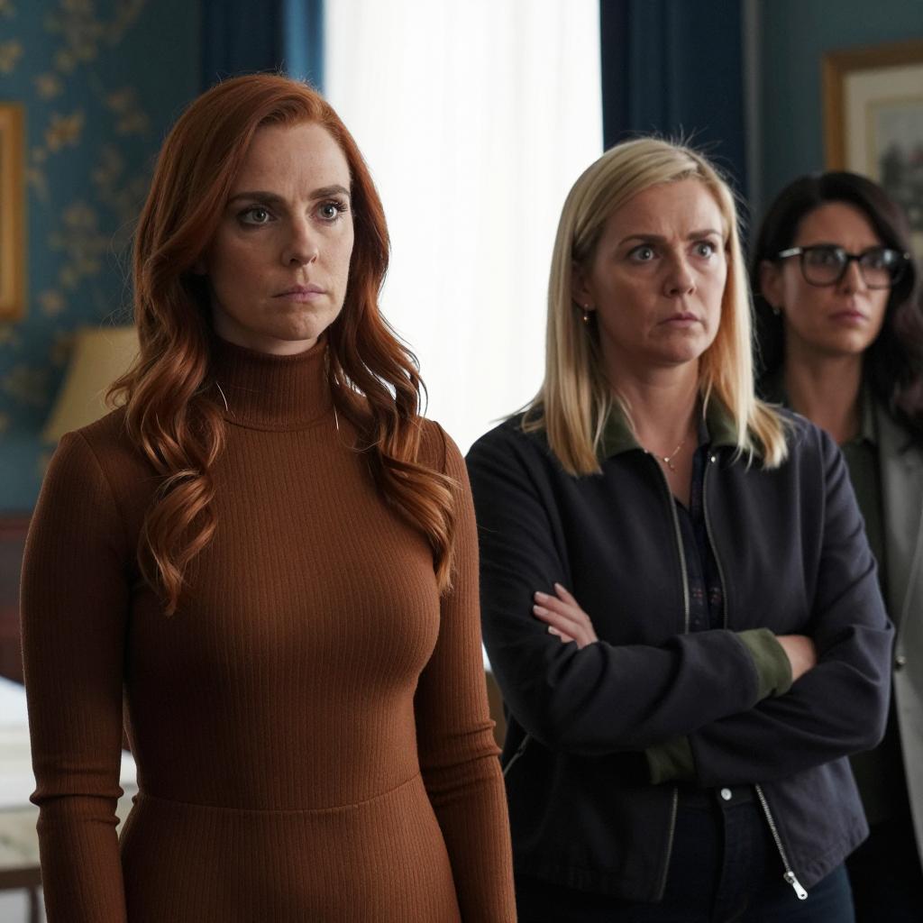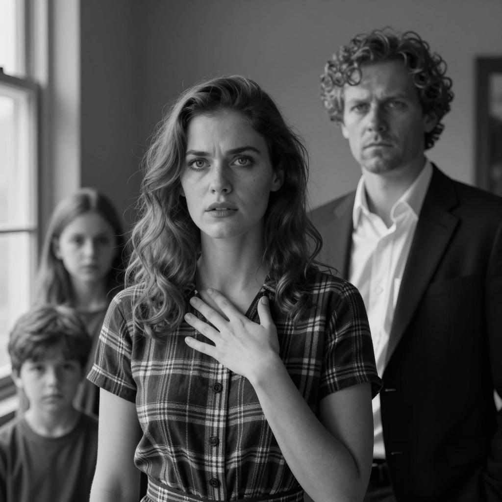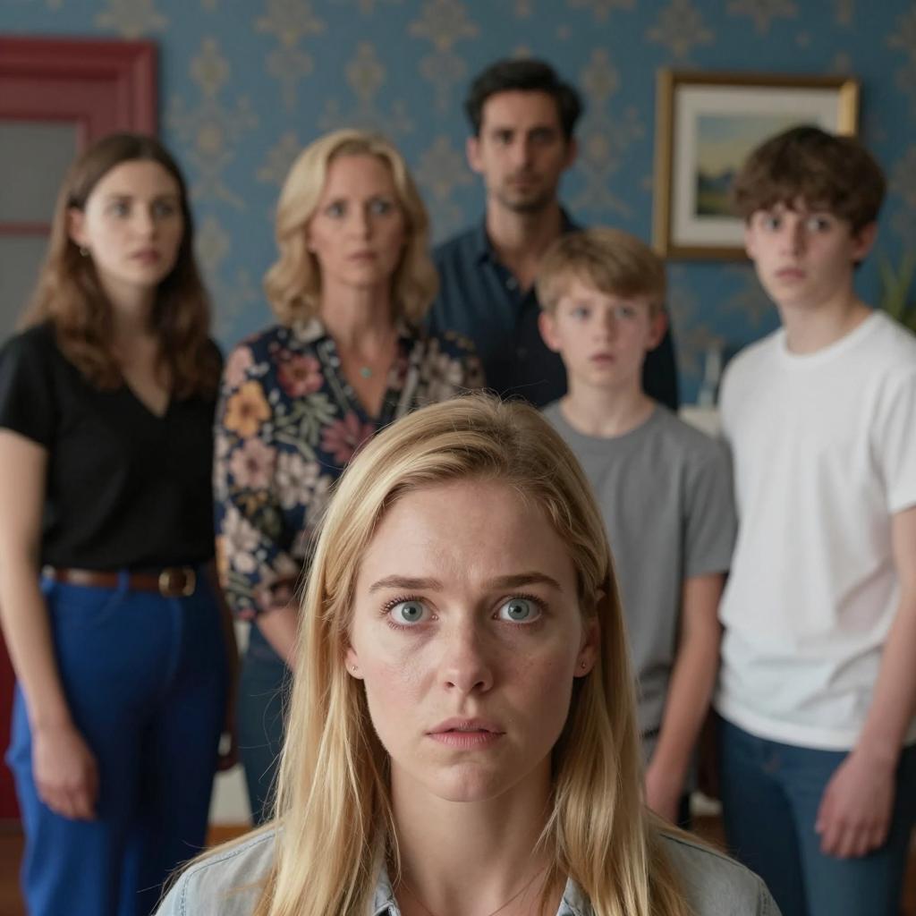 Close-up of a blonde woman with wide, frightened eyes in the foreground. In the background, five people stand with neutral or surprised expressions, including a woman in a black top and blue pants, a woman in a floral blouse, a man in a dark shirt, and two boys in gray and white shirts respectively. The scene features blue patterned wallpaper, red trim, and a framed picture, suggesting an indoor setting.