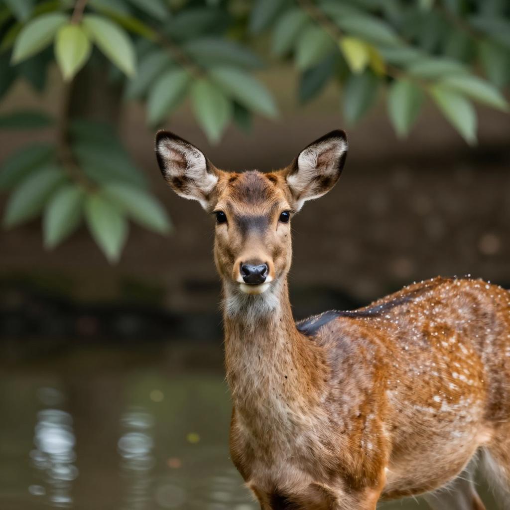 No humans, sunset, outdoors, nature, leopard, animal, animal focus, reflection, water, blurry, forest, looking at viewer, tree, plant, leaf, blurry background, whiskers, realistic