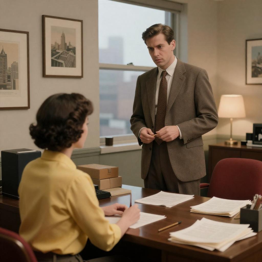 Photograph of a grand living room. Bald man in gray suit plays piano, middle-aged woman in red dress and young man walk towards stained glass windows. Three more people stand near fireplace. Large windows, candle sconces, and wooden furniture. Dim lighting.