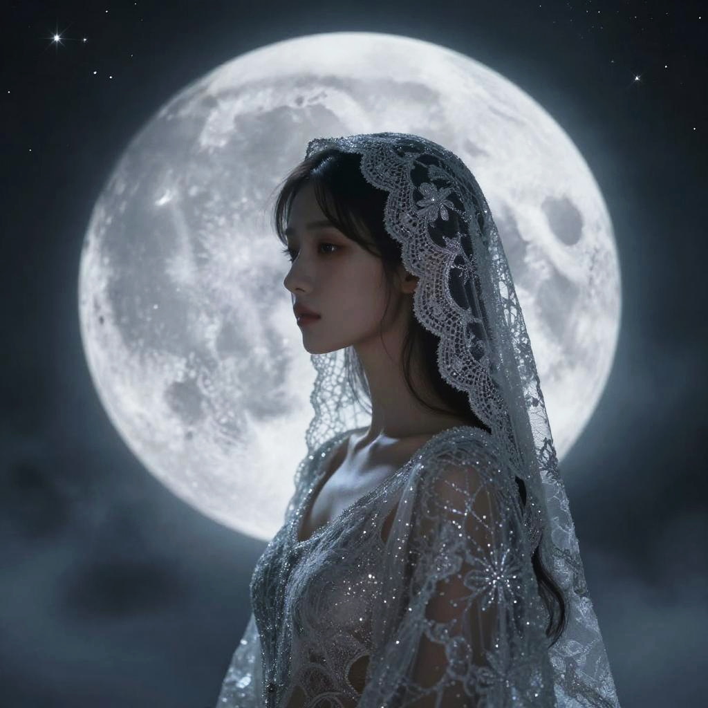 An ethereal depiction of a serene moon guardian, bathed in cool starlit shimmer, with delicate silver lace and mist, art inspired by Elena Gordon.