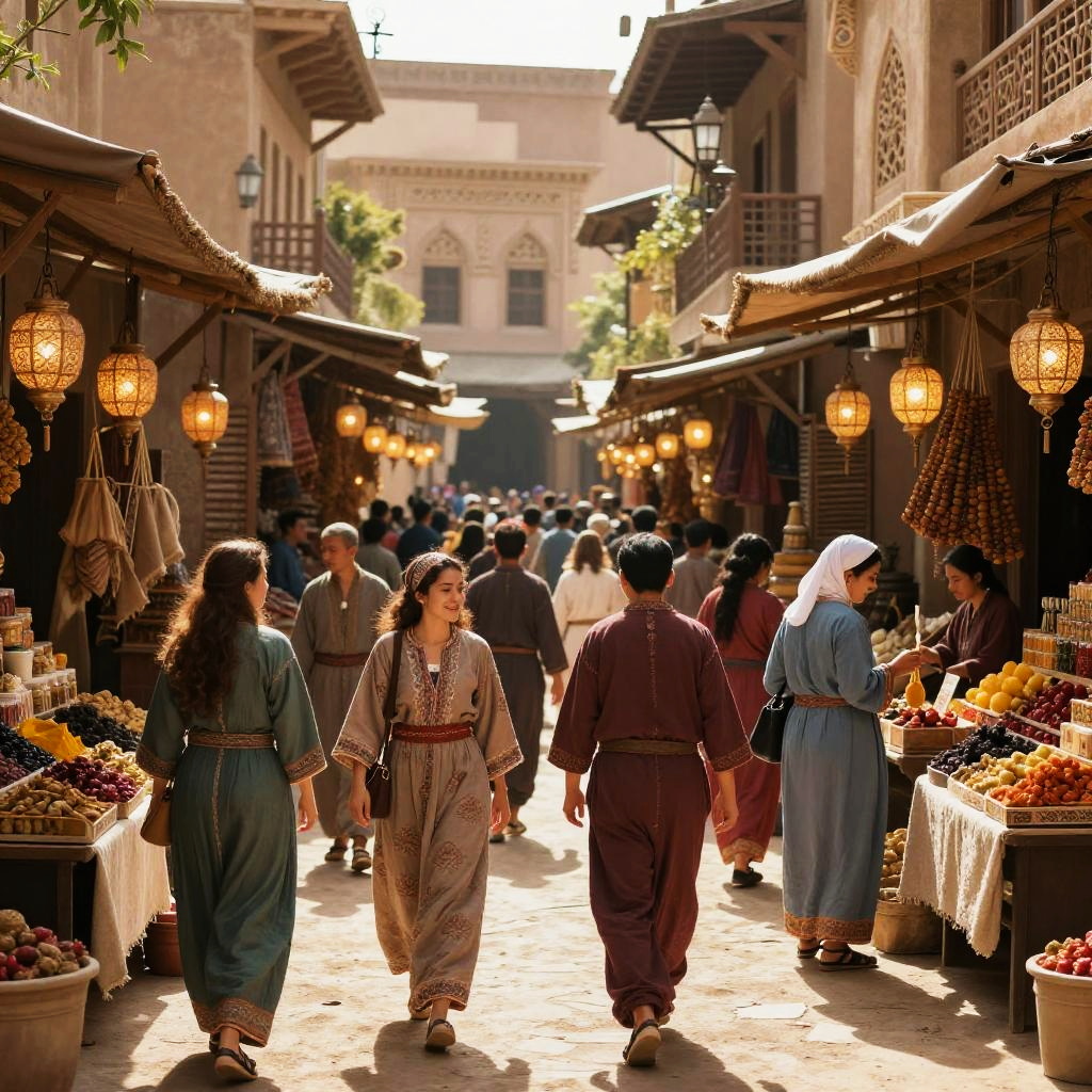 Seria bustling market street, lively crowds in colorful traditional clothing, detailed stalls with exotic goods and spices, warm sunlight filtering through hanging lanterns, intricate architectural details, dynamic perspective, rich textures and vibrant atmosphere in a fantasy realm.
