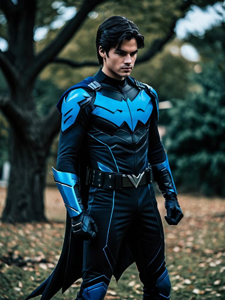 Nightwing dress costume, male focus, 1boy, blurry, blurry background, belt, outdoors, weapon, wings, tree