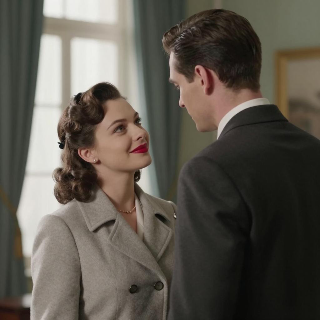 Photograph of a 1930s-style scene. A woman with dark curly hair, wearing a beige coat and black fur collar, sits on a green metal bench holding papers. A man in a gray overcoat and hat stands beside her. A third man in a flat cap and brown jacket stands in the background. Industrial setting with wagons, crates, and a misty background.
