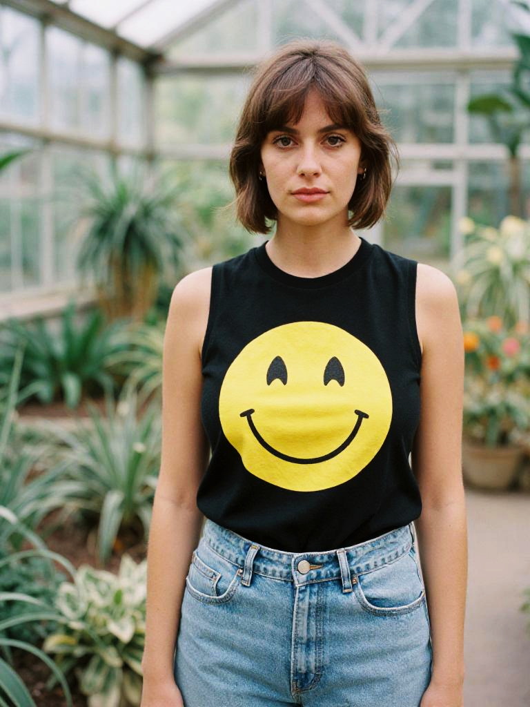 A woman, in a sleeveless black tank top with a yellow face emoji graphic and light-wash denim jeans, relaxed fit, standing in a botanical garden greenhouse, captured in a medium format film style. Sexy. Pretty face and beаutiful eyes. Big breasts