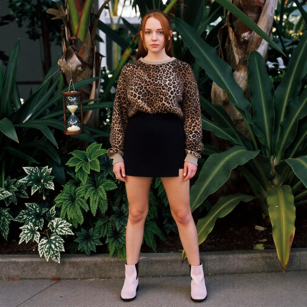 A Hourglass woman in casual streetwear, wearing a brown and black leopard print sweatshirt, a black mini skirt, and light pink flat ankle boots, stands in the Tropical garden with a butterfly garden. Her straight red hair is pulled back, and she has minimal makeup. The scene is captured in the style of Eastman film stock. Sexy. Pretty face and beаutiful eyes. Big breasts