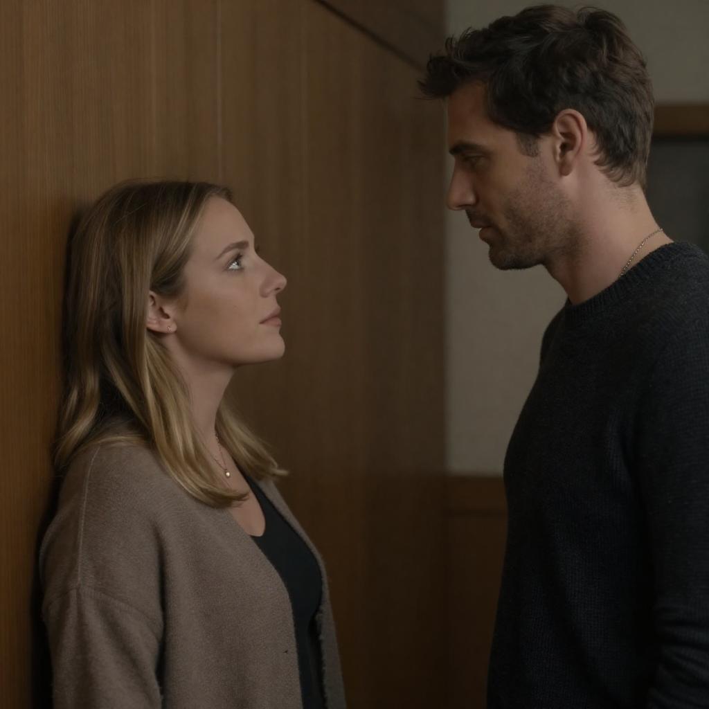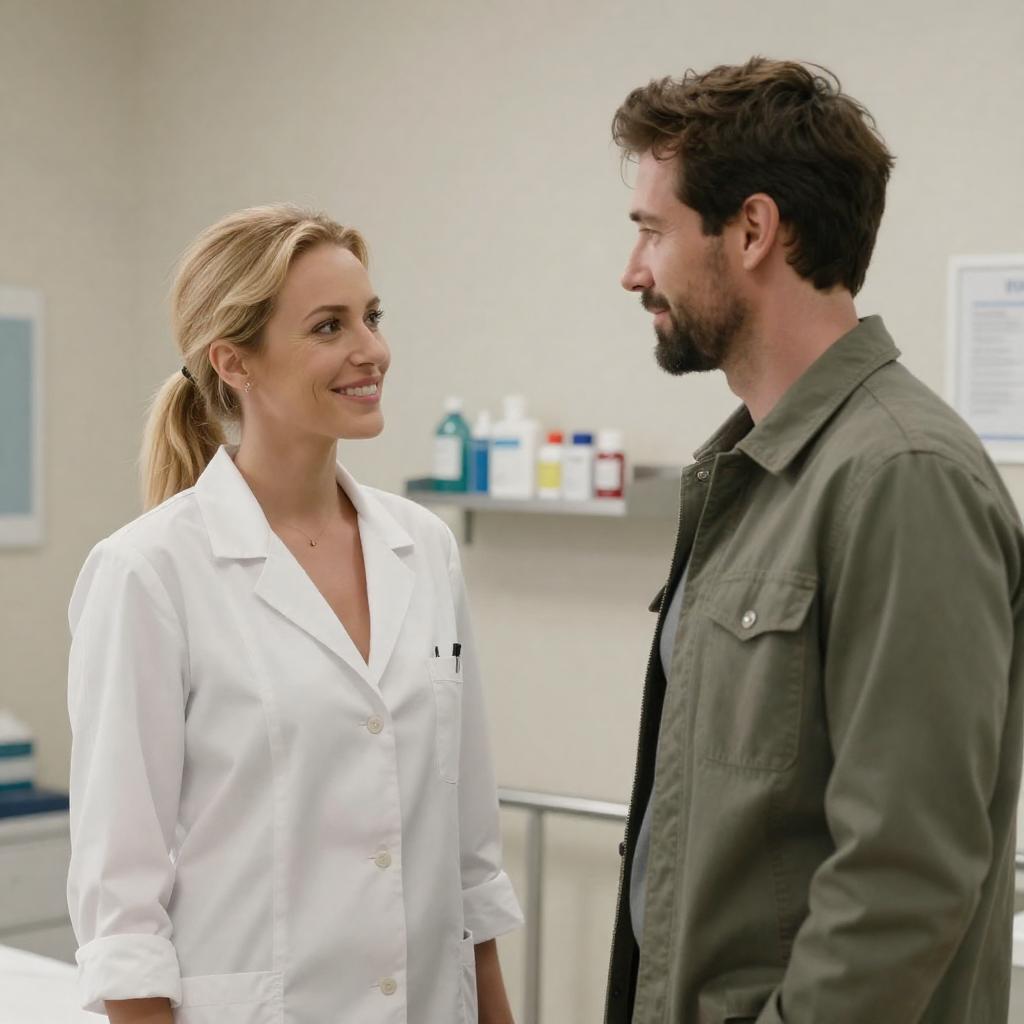 Photograph of a man and woman in a clinical setting. The man with brown hair and beard, wearing a green jacket, stands facing the woman. The woman, with blonde hair in a ponytail, wears a white lab coat, unbuttoned to reveal cleavage. She smiles at the man, who looks at her with a slight smile. Background has a beige wall, a shelf with medical supplies, and a metal rail.