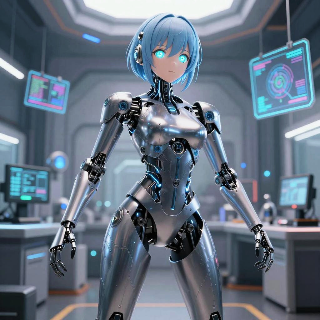 AI anime character generator producing a sleek robotic anime character with smooth metallic body, illuminated circuits running along limbs, expressive LED eyes, posed dynamically in a high-tech laboratory filled with advanced gadgets and holograms.