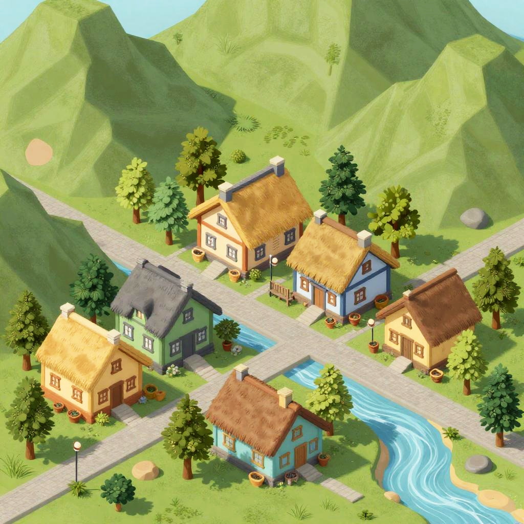 Vista isometrica of a fantasy village nestled in lush green mountains, cobblestone streets, colorful houses with thatched roofs, detailed trees, and a sparkling river flowing through