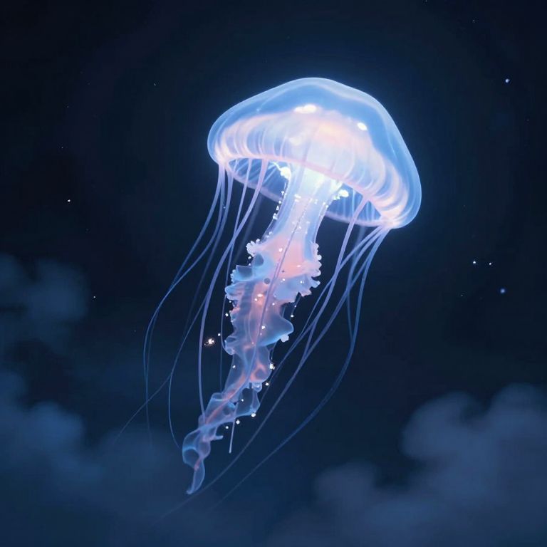 In a twilight realm where dreams and memories intertwine, a luminous jellyfish floats serenely, its ethereal glow casting whispers of hope and introspection upon the drifting clouds, while the void around it echoes with the quiet symphony of forgotten whispers.