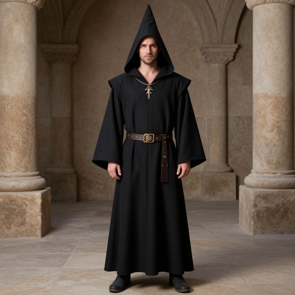 Renaissance Faire Wizard Costume, man in a hooded robe and a belt