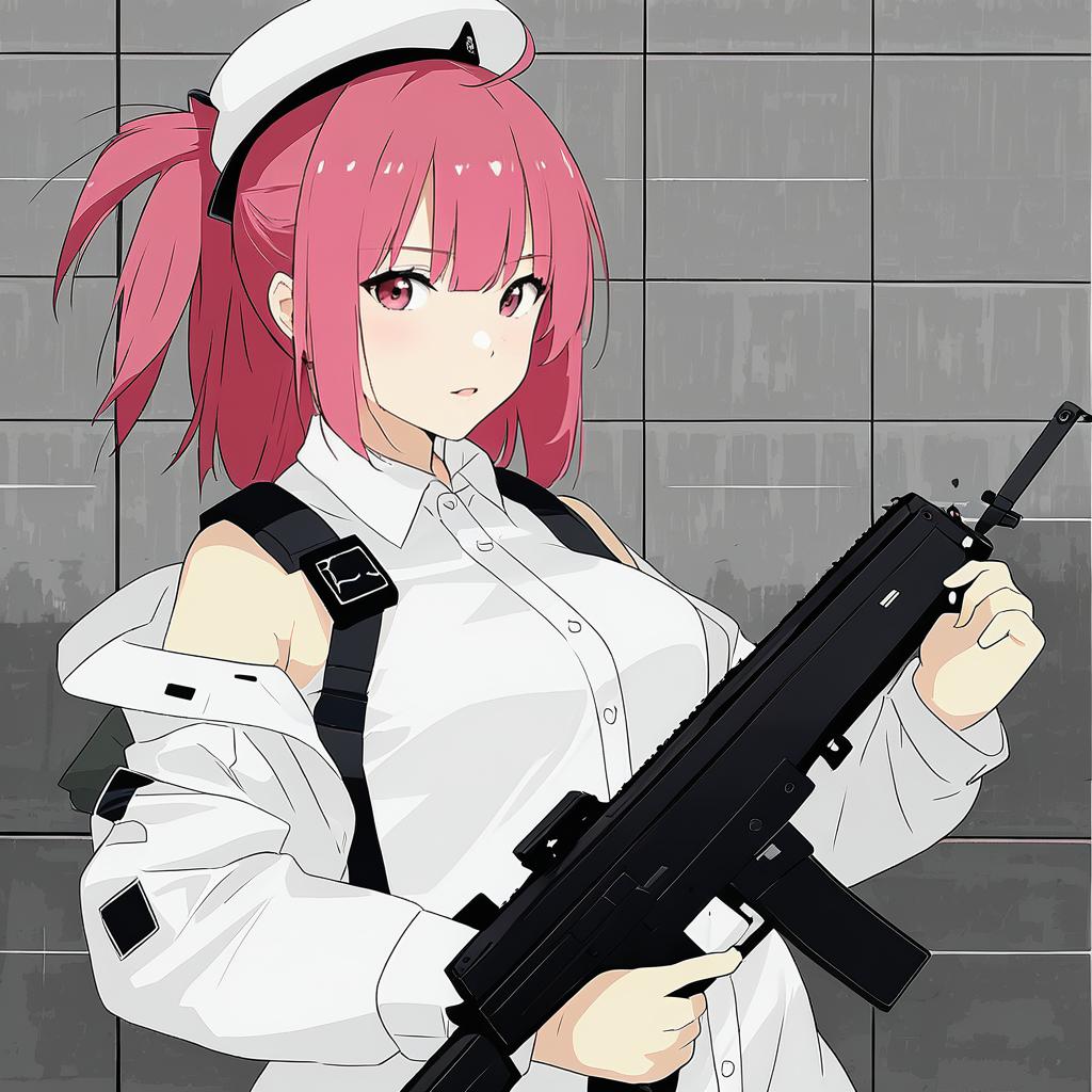 Mp7 (girls' frontline), girls' frontline, 1girl, yellow eyes, red hair, medium hair, pink hair, ahoge, ponytail, side ponytail, medium breasts, white shirt, off shoulder, submachine gun, one side up, beret, by artist saku (kudrove), anime