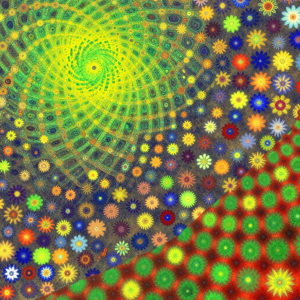 This image is a digital art piece featuring a psychedelic, fractal-like pattern. The top left corner has a green and yellow swirling design, while the right side transitions into a grid of small, colorful, flower-like shapes. The bottom right corner has a red and green pattern, creating a vibrant, eye-catching contrast. The overall texture is pixelated and abstract.