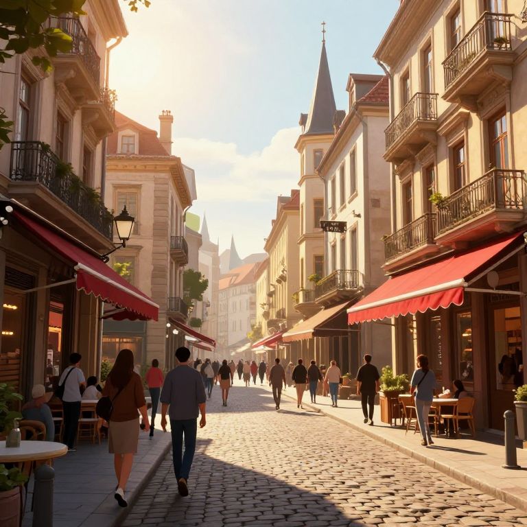 A vibrant digital rendering of a bustling European street bathed in golden-hour light, where red awnings and cobblestone paths evoke a retro charm, and the architectural harmony of spires and balconies hums with the lively whispers of passersby.